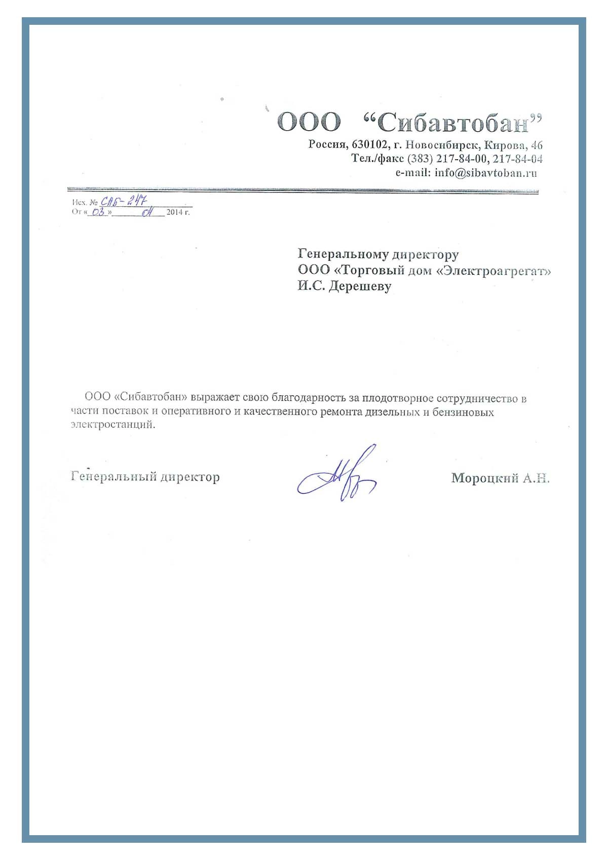ООО "Сибавтобан" выражает свою благодарность за плодотворное сотрудничество в части поставок и оперативного и качественного ремонта дизельных и бензиновых электростанций.